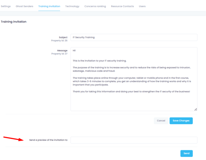 You can send a preview of the introduction course invitation email by navigating to Groups > Edit > Training Invitation > 'Send a preview of the invitation'